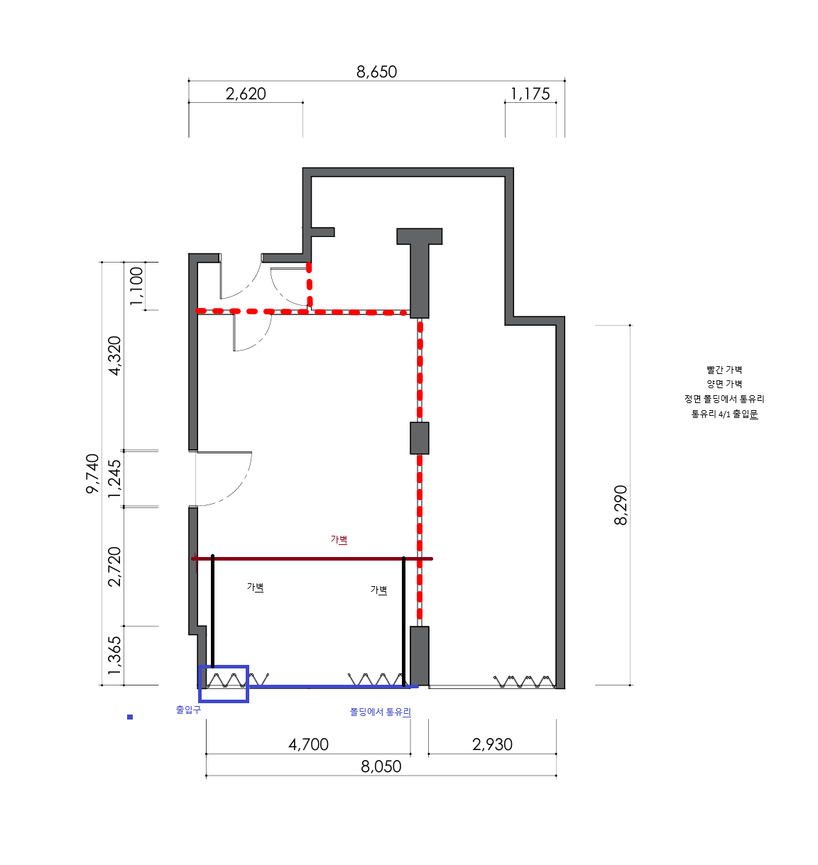| 요청사항 | 새로 이사가는 갤러리 공간이 작아 작품을 걸 수 있는 가벽이 필요합니다. 도면에 보이는 빨간색 부분이 가벽을 설치해야하는 위치고 현관문은 폴딩도어로 되어있는데 통유리로 변경하려고 합니다. 바닥 에폭시가 필요하며 시스템에어컨은 기존 매장에서 운영했던 곳에 떼어 부착 예정입니다. |