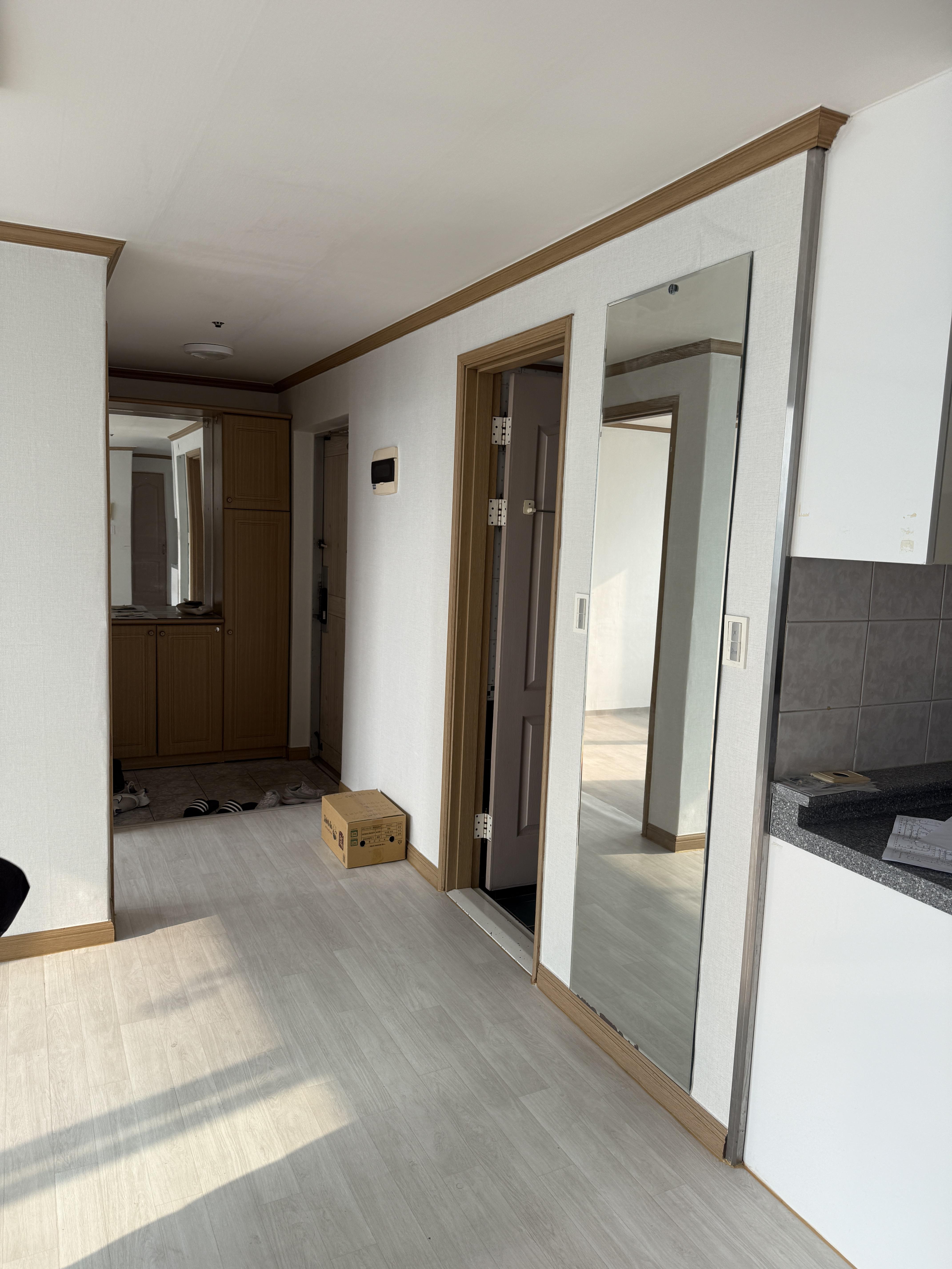 | 요청사항 | 1. 조명 - 다운라이트, 시스템 등 2. 도배 - 실크 3. 바닥 - 장판, LX 2.2T 4. 욕실 - 전체 작업(협의필요) 5. 싱크대 - 하부장 및 타일 교체 가능 여부 확인(협의필요) 6. 문짝틀 및 손잡이 작업 - 문짝틀 및 손잡이 교체(협의필요) 7. 확장방 단열(협의필요) 8. 현관신발장, 타일 9. 몰딩교체 및 걸레받이 설치(협의필요) |